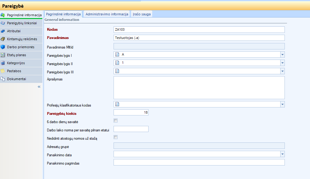 1.2.6. Pareigybių kiekis - nurodomas galimas darbuotojų, dirbančių pagal šią pareigybę skaičius. Jei nurodysite čia 1, tai registruodami darbo sutartį antram šios pareigybės darbuotojui, pateikiamame pareigybių sąraše būtent šios pareigybės pridėti nebebus galima.
