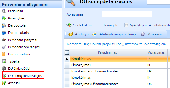 1. Tikrinimui naudokite BSS Personalas ir atlyginimai skiltį DU sumų detalizacijos. Čia pateikiamos visų žiniaraščių smulkiausios eilutės.