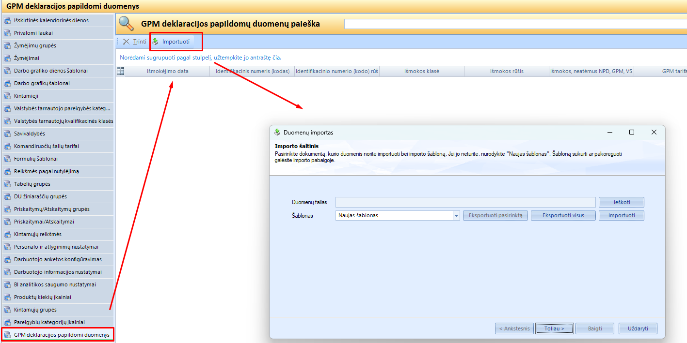 Kaip susiimportuoti duomenis metinei GPM312 deklaracijai, kai dalis metų buvo apskaityta kitoje sistemoje. Ši funkcija skirta suimportuoti duomenis, reikalingus metinei GPM312 deklaracijai, kai klientas pradeda dirbti ne nuo metų pradžios arba išmokos fiziniams asmenims buvo vedamos kitoje sistemoje. Importuoti duomenys naudojami GPM deklaracijos generavimui ir DU ataskaitų rinkinyje (BI, ataskaita Nr. 7). Duomenis galima importuoti iš MS Excel šablono.