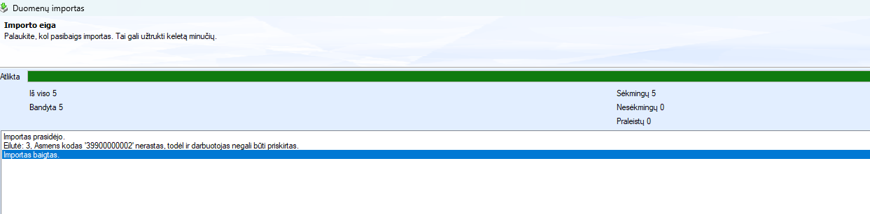 5.3. Jei importuojate duomenis asmens, kuris šiuo metu Jūsų įmonėje nebedirbą (bet praeitų metų deklaracijoje jis turi būti atvaizduojamas), tokiu atveju importo pabaigoje Jums bus pateiktas pranešimas, kad darbuotojas su tokiu asmens kodu nerastas ir įrašui negali būti priskirtas darbuotojas, tačiau darbuotojo duomenys bus suimportuoti, tik suimportuotuose duomenyse nebus nuorodos į darbuotojo kortelę.