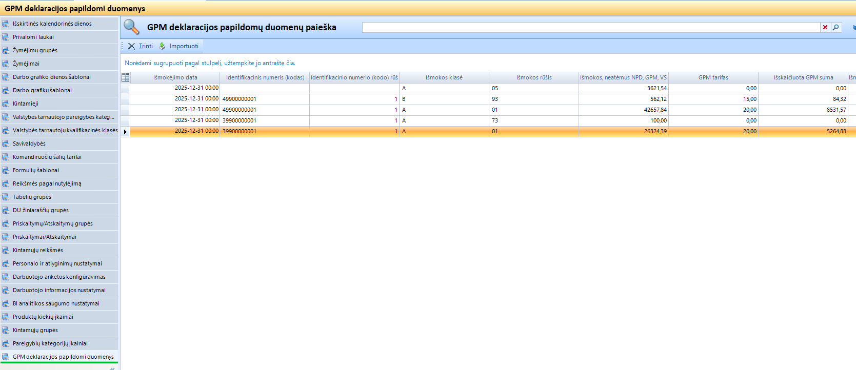 1. Konfigūracija. Importas atliekamas Personalas ir atlyginimai -> Personalo ir atlyginimų konfigūracija -> GPM deklaracijos papildomi duomenys. Ši skiltis matoma tik turint operacijos teisę Leisti matyti GPM deklaracijos papildomus duomenis arba jei turite rolę superadministratorius. Jei skilties nematote - savo turimai rolei pridėkite minėtą operacijos teisę Saugumas -> Naudotojų rolės.