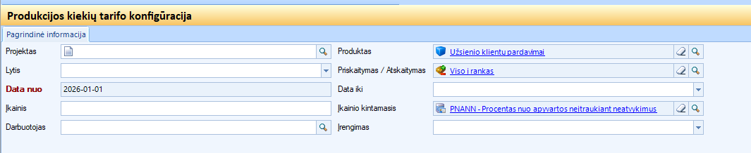 * SRUD teises "Produkcijos kiekių tarifų konfigūracija" ir "Produkcijos kiekis".