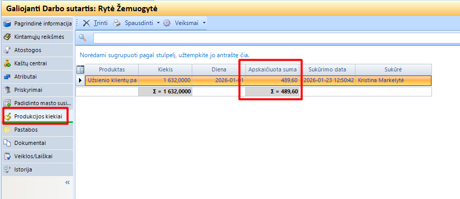 5.3.4. Suimportuotus duomenis galima peržiūrėti tame pačiame lange, iš kurio buvo atliekamas importas, arba darbuotojo darbo sutarties skiltyje Produkcijos kiekiai. Čia stulpelyje taip pat matysite Apskaičiuotą sumą, pagal suimportuotą kiekį ir kintamojo procentą sutartyje.