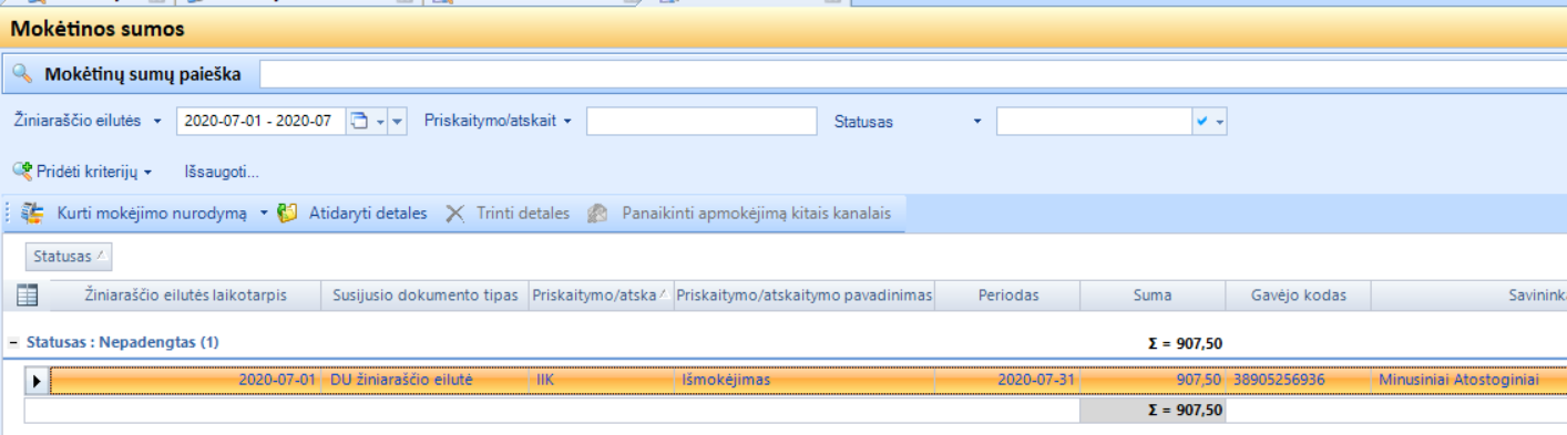 1. Konkretaus laikotarpio mokėtinų sumų filtravimas. Situacija: Jums reikia apmokėti 07 mėnesio neapmokėtas skolas. DU mokėtinų sumų paieškoje prisidėkite filtrą Žiniaraščio eilutės laikotarpis. Čia nurodoma norimo apmokėti mėnesio 1 diena. Paieškoje Jums bus pateiktos tik tos nesumokėtos skolos, kurios buvo apskaičiuotos 07 mėn.