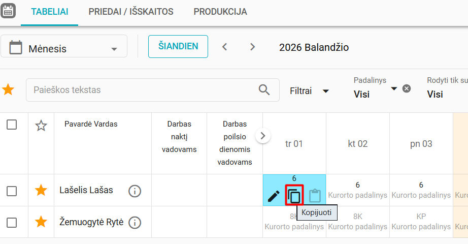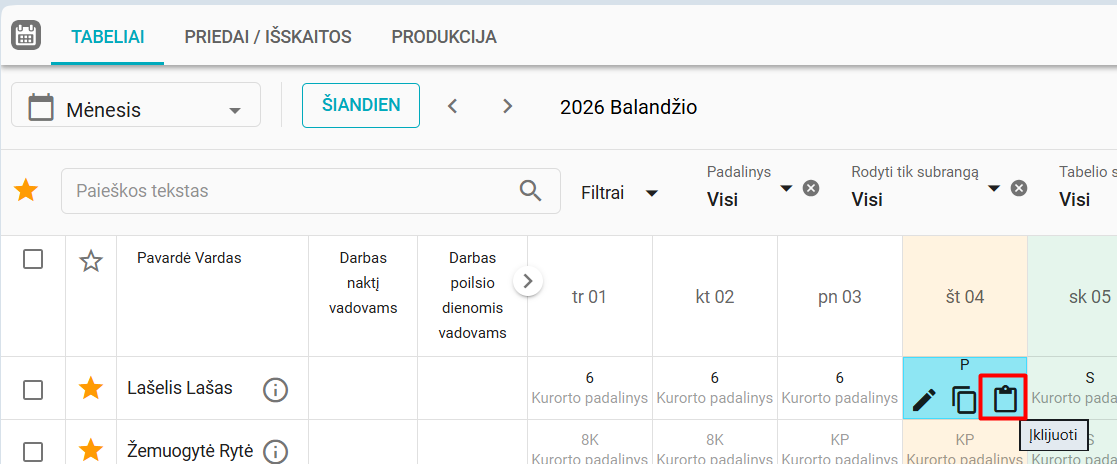 4.3.1. Įklijavimas galimas tik tada, kai pasirinkta diena yra redaguojama – t. y. ji nėra užrakinta, tabelio eilutė nėra uždaryta ir joje nėra personalo operacijų. Kopijavimas taip pat negalimas iš dienų, kuriose yra personalo operacijų. Jei šios sąlygos neatitinka, veiksmai tampa neaktyvūs arba sistema pateikia validacijos pranešimą.