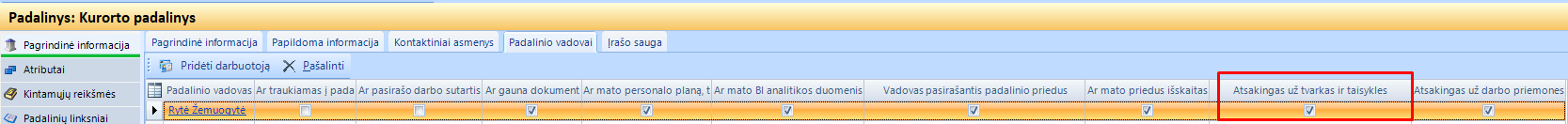 5.1. ERP atverkite reikiamą padalinį Personalas ir atlyginimai -> Padaliniai ir perėję į skiltį Padalinio vadovai pridėkite darbuotoją, bei pažymėkite varnelę Atsakingas už tvarkas ir taisykles. Po šių veiksmų, nurodytas darbuotojas portale matys tik savo vadovaujamo padalinio Darbuotojus ir jų veiklas.