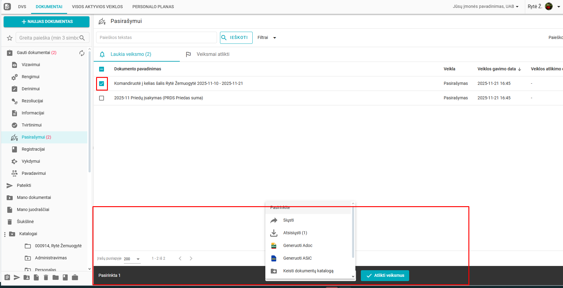 2.1. Siųsti. Šiuo veiksmu galite inicijuoti pasirinktų objektų išsiuntimą. Būsite nukreipti į procesų siuntimo langą, kur galėsite susidėlioti kokiems dalyviams norite išsiųsti pasirinktus dokumentus.