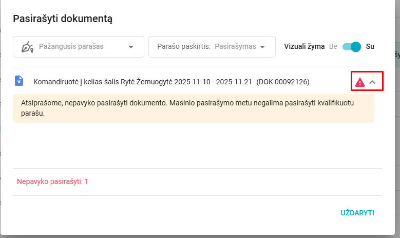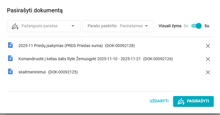 Svarbu: jei pasirinktame pasirašomų dokumentų sąraše bus dokumentų, kuriuose nurodytas parašo tipas Kvalifikuotas parašas - tokių dokumentų pasirašyti nepavyks, o Jūs apie tai būsite informuoti pranešimu.