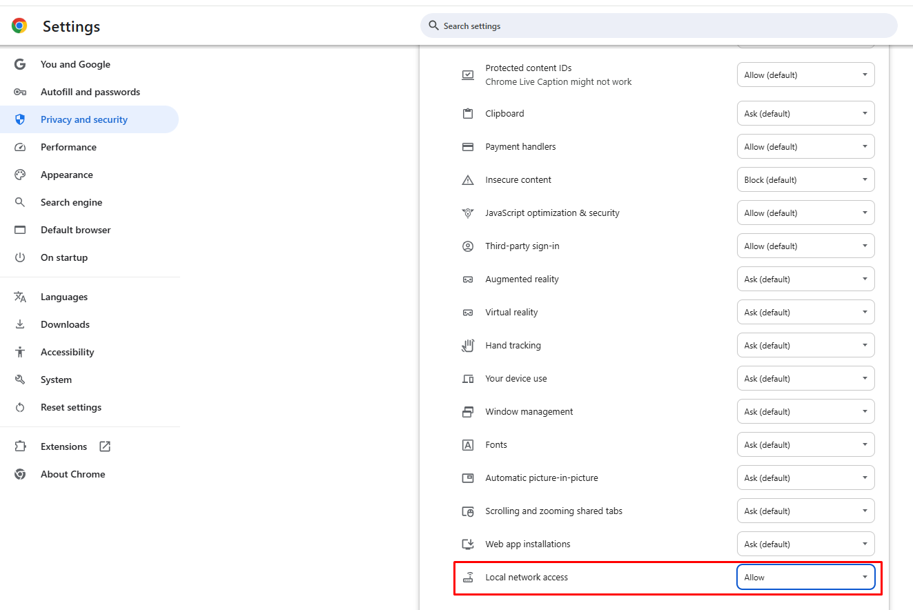 * Chrome naršyklė rodo pranešimą apie Local Network Access arba blokuoja ryšį;